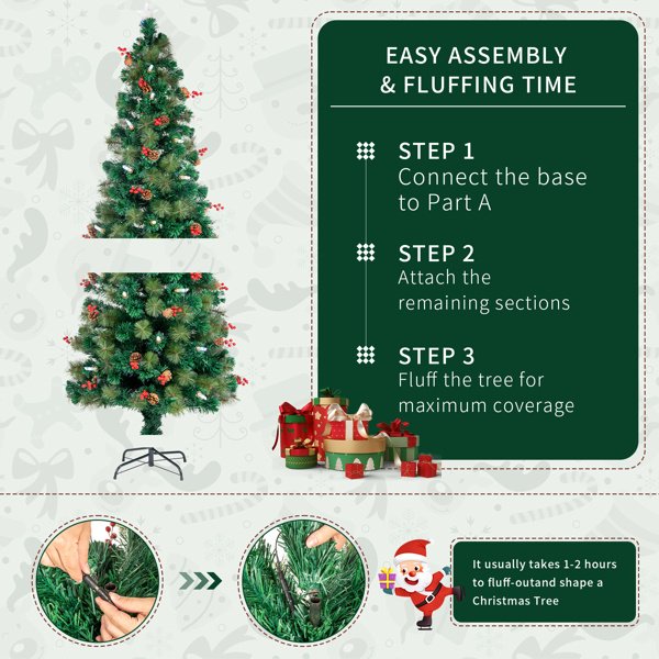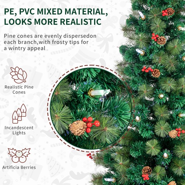 Have a Good and Exciting Christmas! Convenient Assemby. The hinged branches can be expanded effortlessly.which greatly save your energy and time. Glittery PVC leaves and pineneedles make the tree as realistic andvivid as a natural tree. Natural pine cones, cute redberries and LED lights are the mostattractive things on the tree.