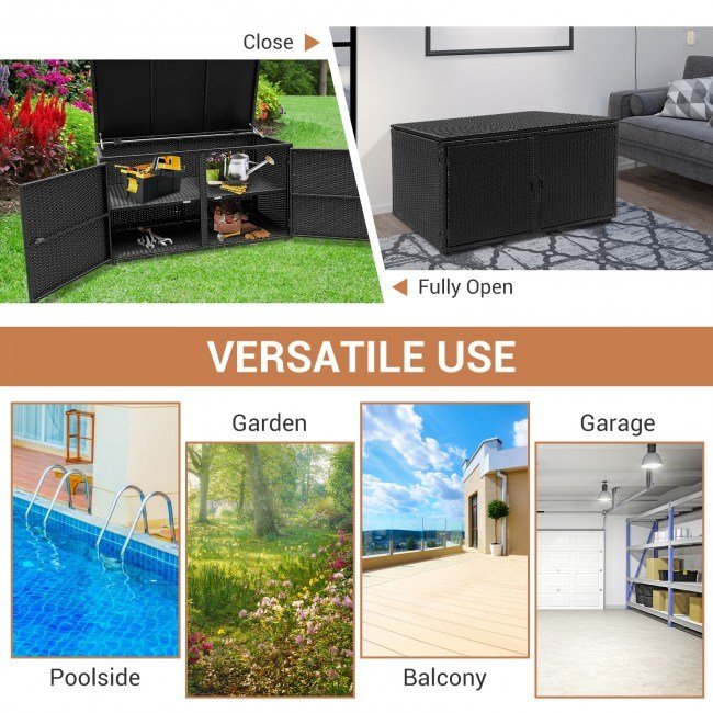 This garden bench box maximizes storage space and increases patio seating capacity while providing an attractive focal point to your garden or patio. It is made of sturdy steel; PE wicker; and weather-proof for durable use. When you lack space for storing your belongings outdoors; the box will work perfectly with a large capacity for storing your cushions; cleaning tools; and other items. There are two layers in the box to help you make full use of space. In addition; it is easy to store or take things because the box can be opened at the top or front. With concise design; it is ideal to place the storage box in your garden; patio; balcony; poolside; backyard; lawn; and other outdoor space in your house. Comes with detailed instructions; you can install the box quickly.