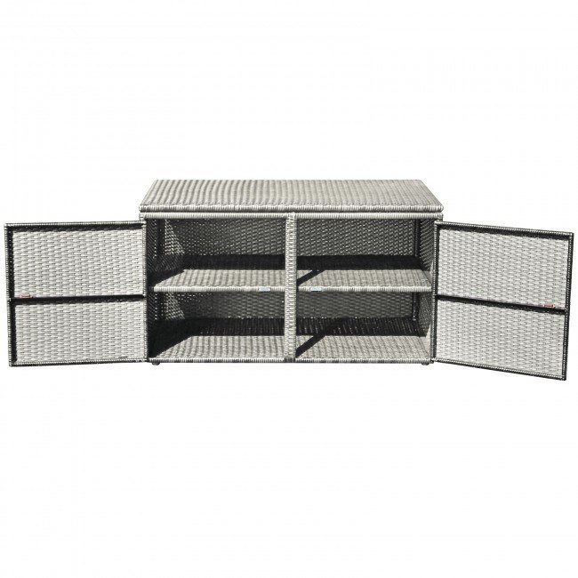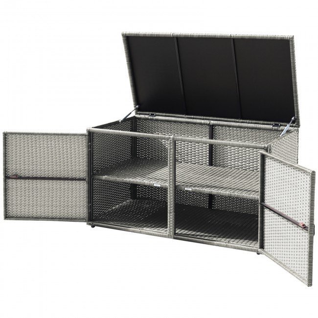 This garden bench box maximizes storage space and increases patio seating capacity while providing an attractive focal point to your garden or patio. It is made of sturdy steel; PE wicker; and weather-proof for durable use. When you lack space for storing your belongings outdoors; the box will work perfectly with a large capacity for storing your cushions; cleaning tools; and other items. There are two layers in the box to help you make full use of space. In addition; it is easy to store or take things because the box can be opened at the top or front. With concise design; it is ideal to place the storage box in your garden; patio; balcony; poolside; backyard; lawn; and other outdoor space in your house. Comes with detailed instructions; you can install the box quickly.