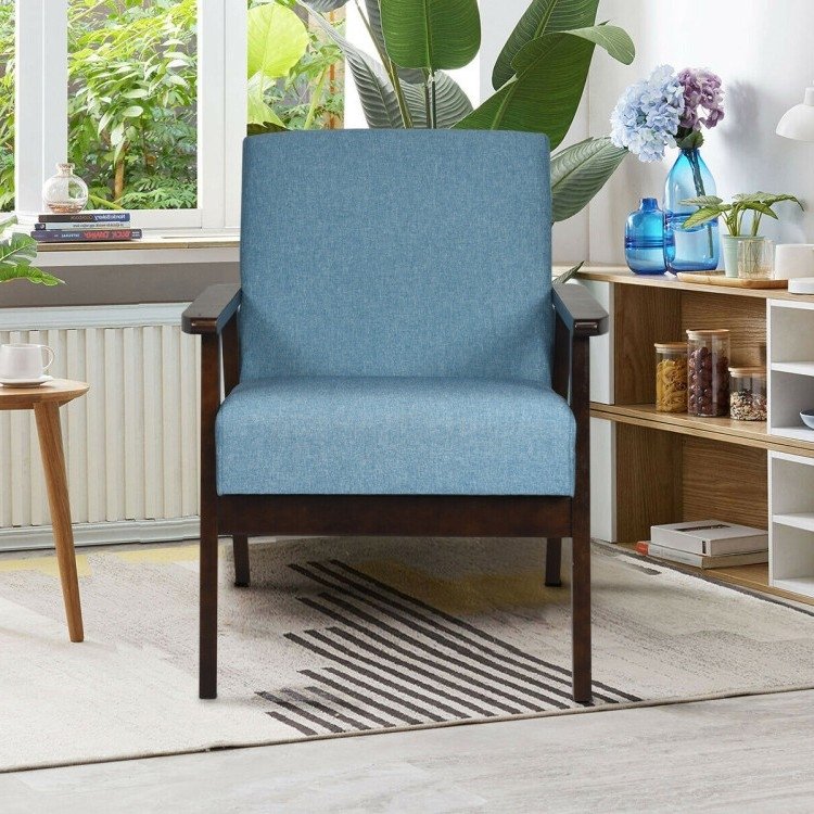 Sit back and relax in this Retro Linen Wide Accent Chair w/ Espresso Rubber Wood Frame - Blue. Ergonomic armrest is designed for relaxing your arm and hands. Wide back design can support your spine nicely and distribute pressure evenly when you lean on it and the chair is equipped with antiskid foot pads to prevent the floor from being scratched. Made of natural rubber wood frame, this accent chair is firm and wear-resistant for long service time. It has no burr and no smell for safe use. Thanks to premium material and sturdy structure, it can withstand up to 330 lbs. without wobbling. The seat and back are filled with high-density sponge, which is soft enough for you to enjoy yourself and relax your body after tired work. Besides, fine linen cover features gentle texture and friendly touch, providing you with extra comfortable feeling.